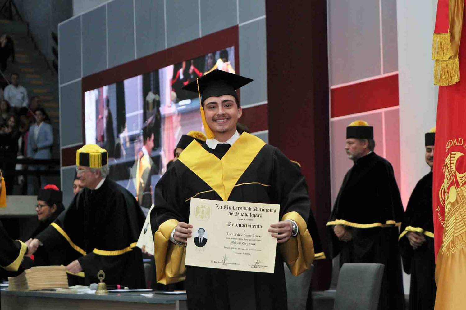 En su discurso, el padrino de generación, el Dr. Juan Jorge Beltrán Ochoa, Director General del Departamento de Hemodinámica y Jefe de Cardiología en el Hospital Regional Dr. Valentín Gómez Farías, felicitó a los graduados por su formación en la UAG.