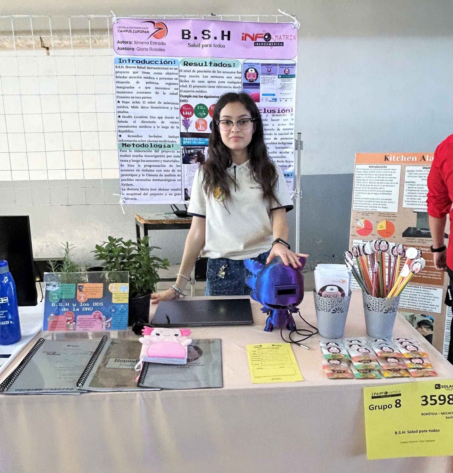 La alumna Ximena Yaretzy Estrada Reynoso, de segundo semestre de preparatoria, destacó con BCH (Buena Salud Herramientas), que es un robot de asistencia médica que mide temperatura y pulso cardíaco. Este trabajo incluye una aplicación con ubicaciones de hospitales, contactos de especialistas, un recetario de plantas medicinales y una cámara para detectar anomalías dermatológicas. Por este proyecto, le otorgaron la medalla de bronce.