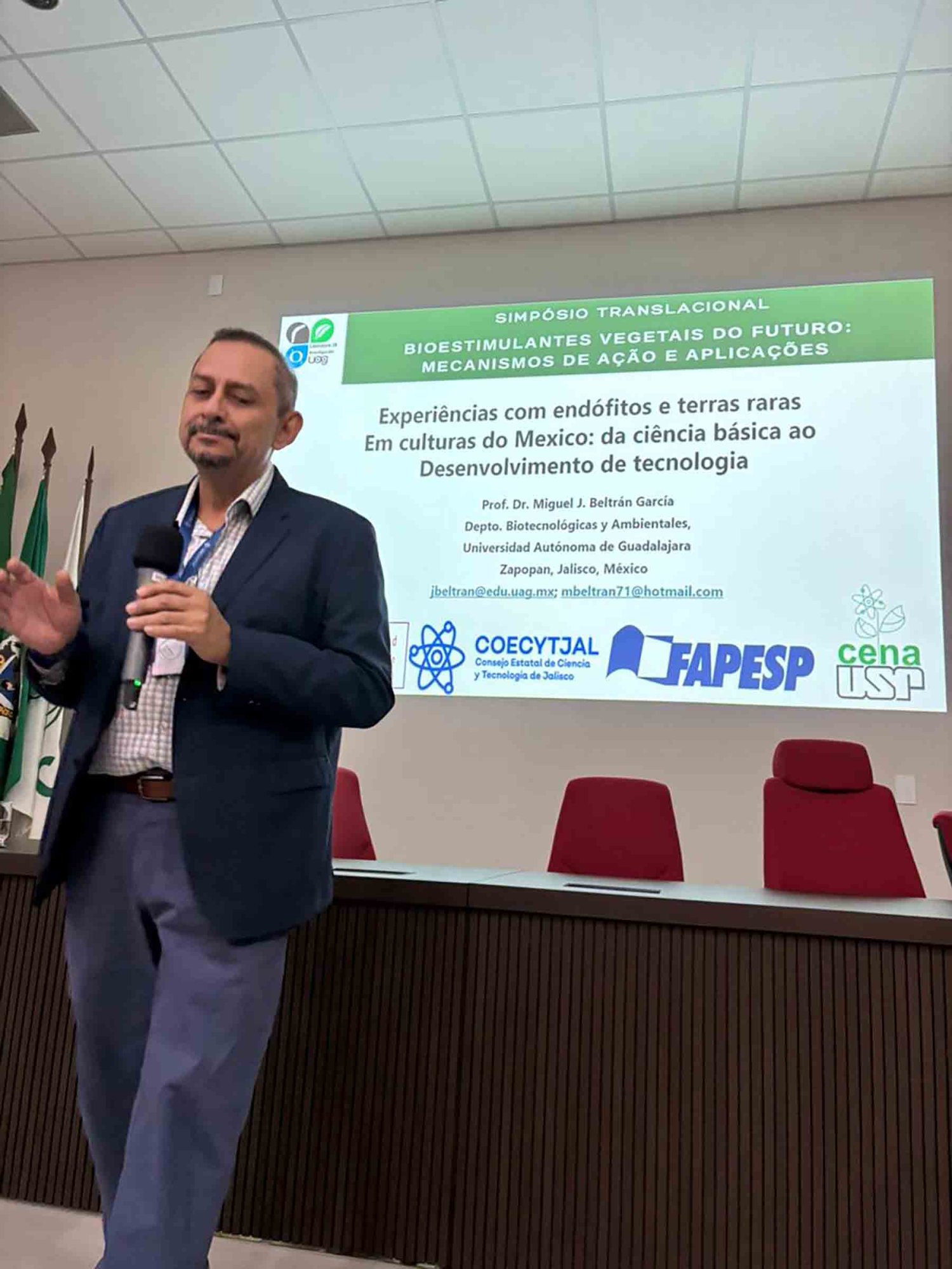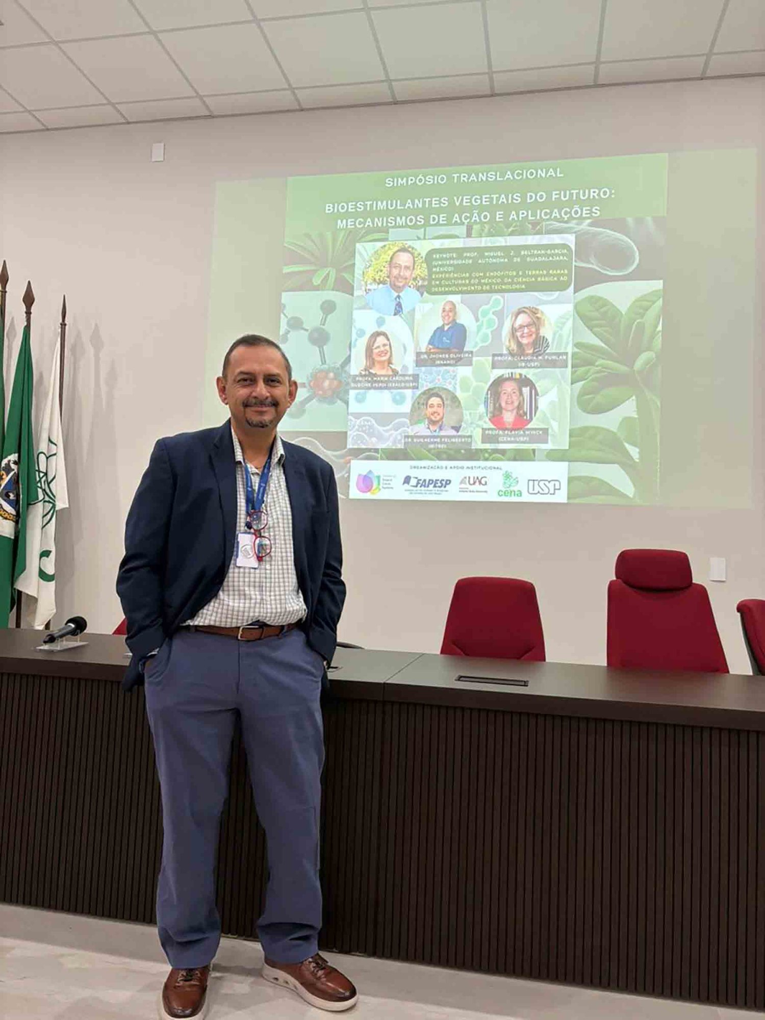 Como parte de su estancia, el Dr. Beltrán García participó como conferencista principal en el Simposio Traslacional “Bioestimulantes Vegetales del Futuro”, realizado en el CENA–USP, que reunió a especialistas académicos y representantes del sector productivo.